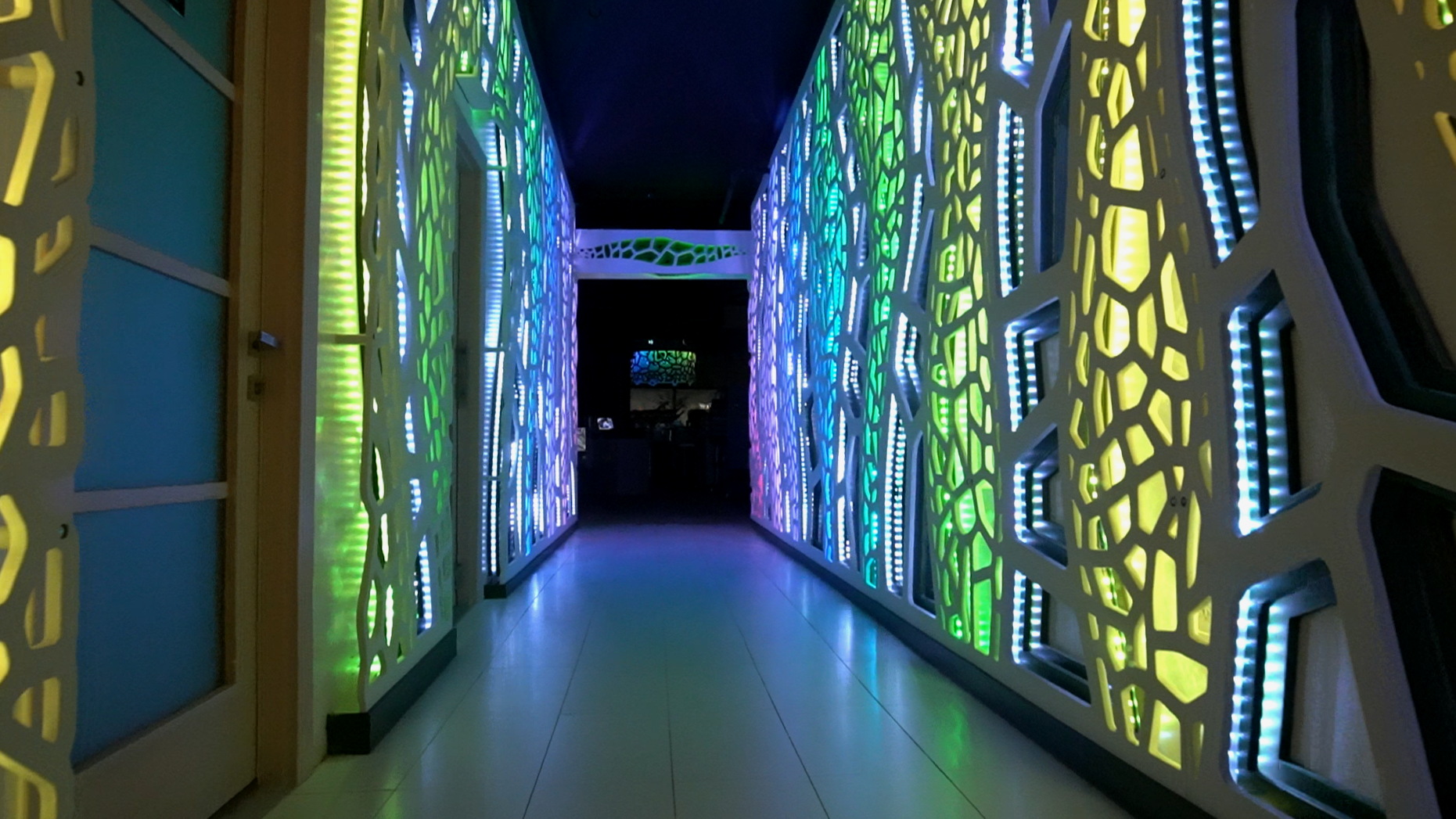 An immersive architectural art installation featuring 32,000 LEDs embedded into custom designed decorative millwork. The installation washed the main entryway to the dining area in thematic colors, replicating scenes in nature, through intricate three-dimensional patterns of light and color. This installation transformed a liminal, transitory space into a hallmark feature with a singular goal to create “Instagrammable” moments.